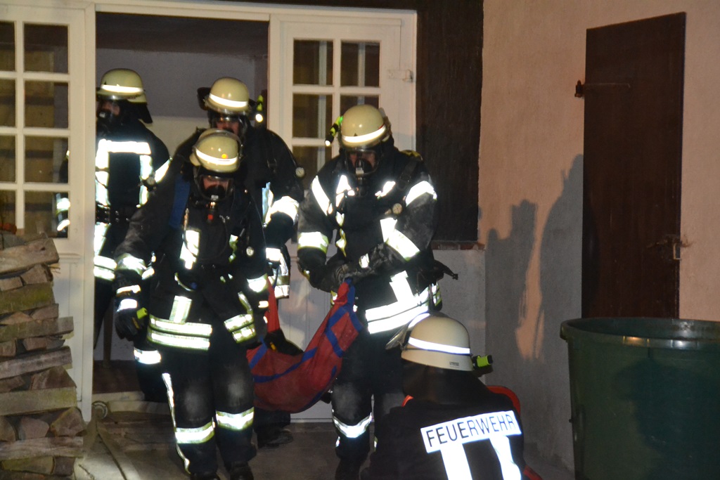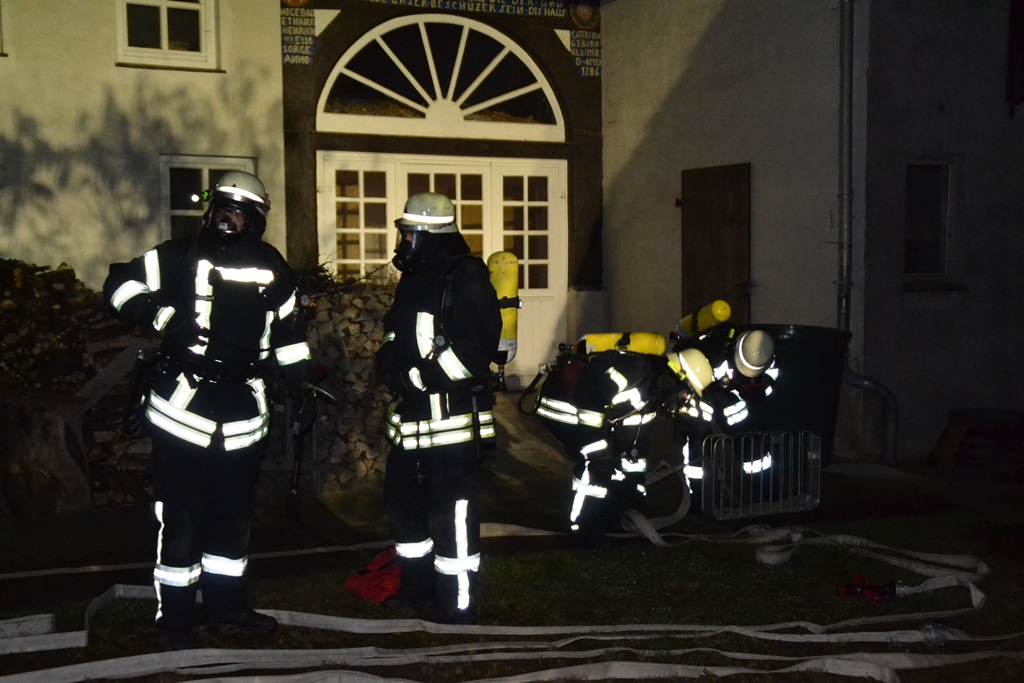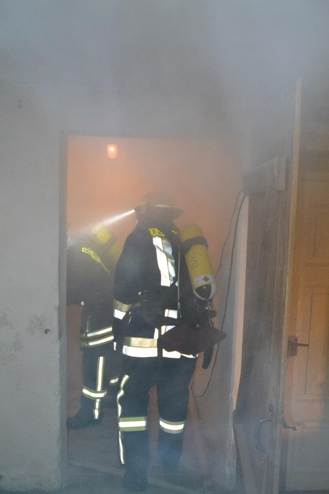 Die Personensuche gestaltete sich sehr schwierig, da das Gebäude sich über 3 Geschosse erstreckt und sehr verwinkelt, mit vielen Räumen gebaut ist. Schließlich wurden jeweils 1 Person im Keller und 1 Person auf dem Dachboden gefunden und geborgen. Der Schwelbrand war schnell gelöscht. Mit einem Hochleistungslüfter wurde der Rauch aus dem Gebäude geblasen.