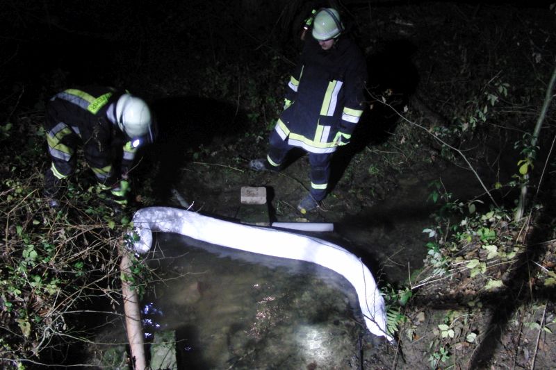 Da weiterhin gering Öl aus dem Kanal in einen Bach floss, wurden zu Sicherheit an 2 Stellen schwimmende Ölsperren aufgebaut und Bindemittel auf das Wasser aufgebracht.
