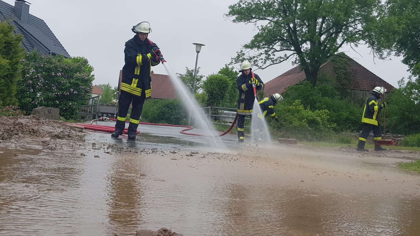 In der Howe war die Straße auf gut 100 Meter noch mit teilweise 10 cm dickem Schlamm bedeckt, der für Fußgänger den Weg unpassierbar und – bei erneut einsetzendem Regen – für Autofahrer die Fahrt in die Mauer bedeutet hätte. Wir reinigten die Fahrbahn mit der Strahlrohren.