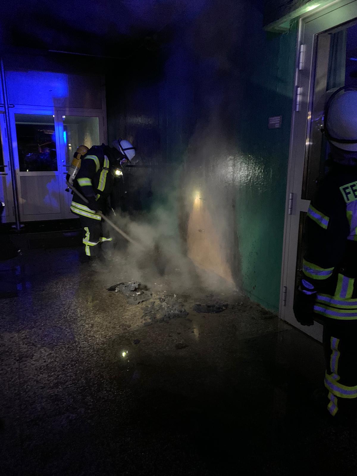Im Blomberger Schulzentrum Nähe des Aula-Eingangs brannte eine Mülltonne am Gebäude. Wir löschten die Überreste mit der Schnellangriffseinrichtung des LF 20 ab.