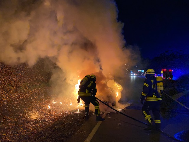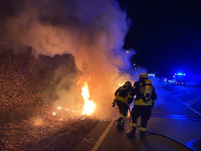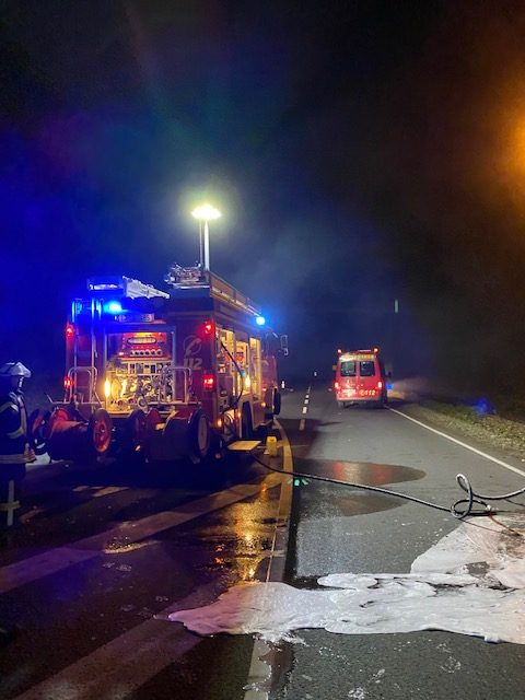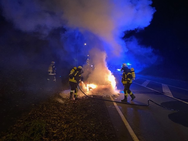 Auf der B1 Hellweg kurz vor der Brücke in Richtung Herrentrup kam es zu einem PKW-Brand. Als wir eintrafen stand bereits der komplette vordere Bereich des PKW´s in Vollbrand. Der Blomberger Rettungswagen der von einer Einsatzfahrt zurück kam, leistete sofort Erste Hilfe. Wir löschten den PKW mit der Schaum-Pistole ab und reinigten anschließend die Fahrbahn.