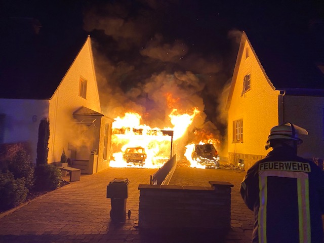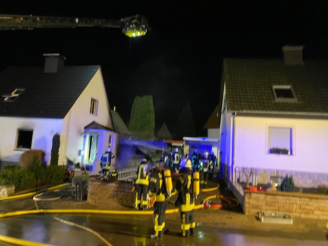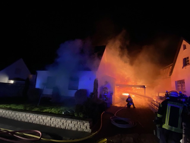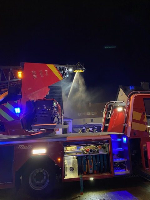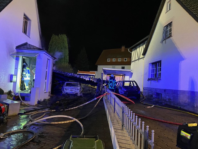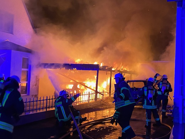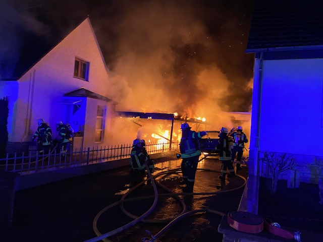 Wir wurden zunächst mit dem Stichwort Feuer 2 Feuer im Carport alarmiert jedoch wurde das Stichwort nach kurzer Zeit, aufgrund von weiteren Anrufen durch die Leitstelle auf Feuer 3 erhöht. Beim Eintreffen an der Einsatzstelle brannten 2 PKW´s und ein Carport im Vollbrand. Ein PKW brannte unter dem Carport, ein weiterer PKW, vor der Garage des Nachbargrundstücks, hatte sich durch die enorme Hitze ebenfalls entzündet. Das Feuer hatte sich bereits in das Erdgeschoss des Wohnhauses gefressen. Auf dem Nachbargrundstück drohte das Feuer ebenfalls durch ein Fenster in das Wohnhaus einzudringen, dieses konnten wir allerdings mit einem massiven Außenangriff verhindern. Es wurde sofort eine Brandbekämpfung von innen und außen mit insgesamt 5 Atemschutztrupps durchgeführt. Zusätzlich bekämpften wir das Feuer von oben über die Drehleiter und leuchteten die Einsatzstelle aus. Die Wasserversorgung konnte durch Unterflurhydranten sichergestellt werden. Zum Glück waren bei Eintreffen der Feuerwehr keine Bewohner mehr in ihren Häusern, so dass wir direkt mit der Brandbekämpfung beginnen konnten. Zum Eigenschutz der Kameradinnen und Kameraden standen uns ein Rettungswagen vom Regelrettungsdienst sowie 2 Krankentransportwagen der Johanniter Unfall Hilfe Blomberg zur Verfügung. Nach dem das Feuer gelöscht war, standen umfangreiche Nachlöscharbeiten und Lüftungsmaßnahmen an. Die Einsatzstelle wurde durch die Kriminalpolizei zunächst beschlagnahmt.