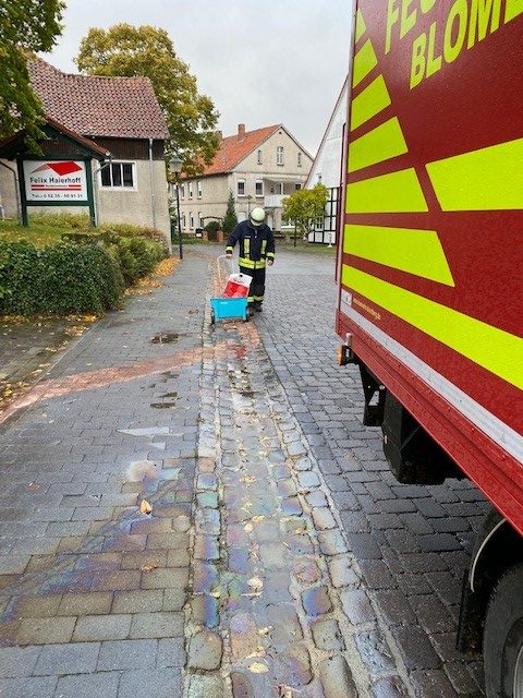 Eine Ölspur erstreckte sich von Reelkirchen Mittelstraße über den Spielberg bis nach Belle. Während wir die Ölspur ab streuten kam es zu einem starken Regenschauer. Vorsorglich wurde eine Öl-sperre im nahegelegenen Regenrückhaltebecken installiert.