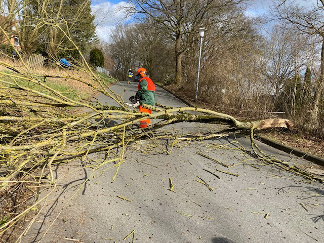 Zwischen der Holstenhöfener Straße und Auf dem Stollen drohten 2 Bäume auf die Fahrbahn zu stürzen. Beide Bäume wurden mit der Motorsäge gefällt und zerteilt sowie die Fahrbahn gereinigt.