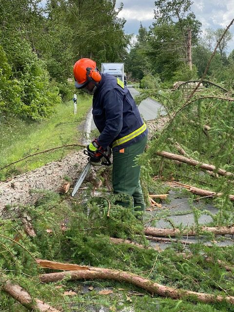 Der Baum wurde mittels Kettensäge zerteilt und wurde an die Seite geräumt. Anschließend wurde die Fahrbahn gereinigt.