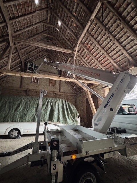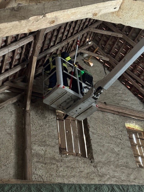 Ein Bürger meldete eine junge, hilflose Katze im inneren Dachbereich einer hohen Scheune. Nach Erkundung an der Einsatzstelle konnte festgestellt werden das die junge Katze sich hoch oben auf einem Balken befand und am miauen war. Da ein größeres Wohnmobil im Weg stand, konnte keine tragbare Leiter aufgestellt werden. Nach kurzer Überlegung entschied man sich dafür den gemieteten Hubsteiger vom Baubetriebshof anzufordern. Mit diesem konnte man rückwärts in die Scheune einfahren und die Katze schlussendlich retten.