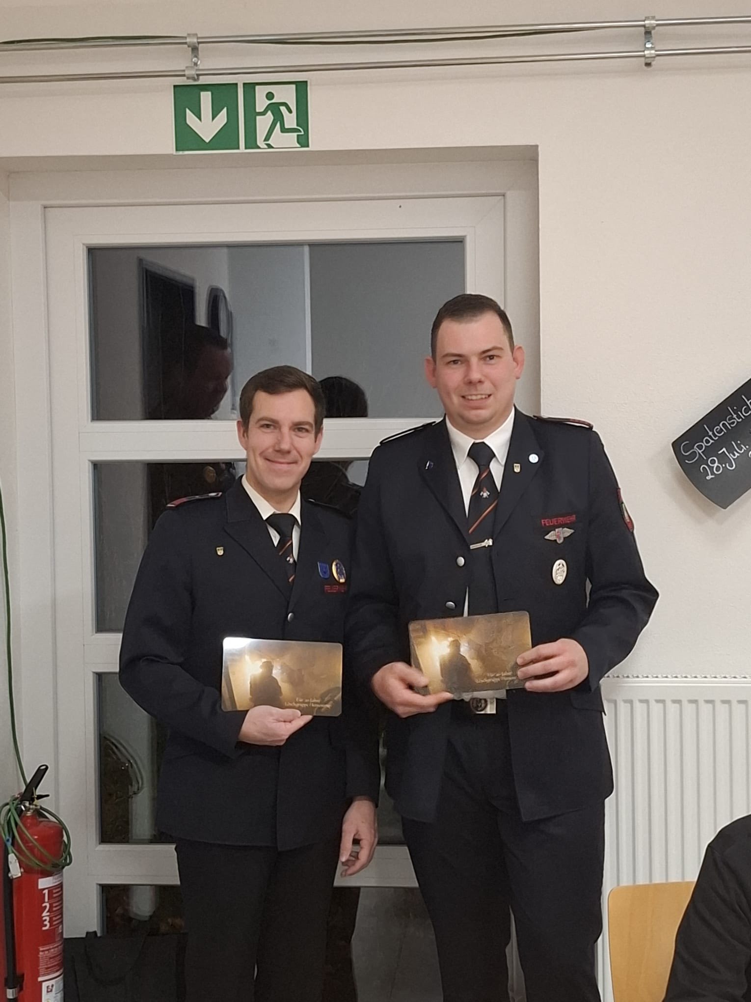 Über eine Ehrung für 20 Jahre Mitgliedschaft in der Löschgruppe Herrentrup durften sich Hauptbrandmeister Marvin Söhlke (links im Bild) & Unterbrandmeister Patrick Nolte (rechts im Bild) besonders freuen!