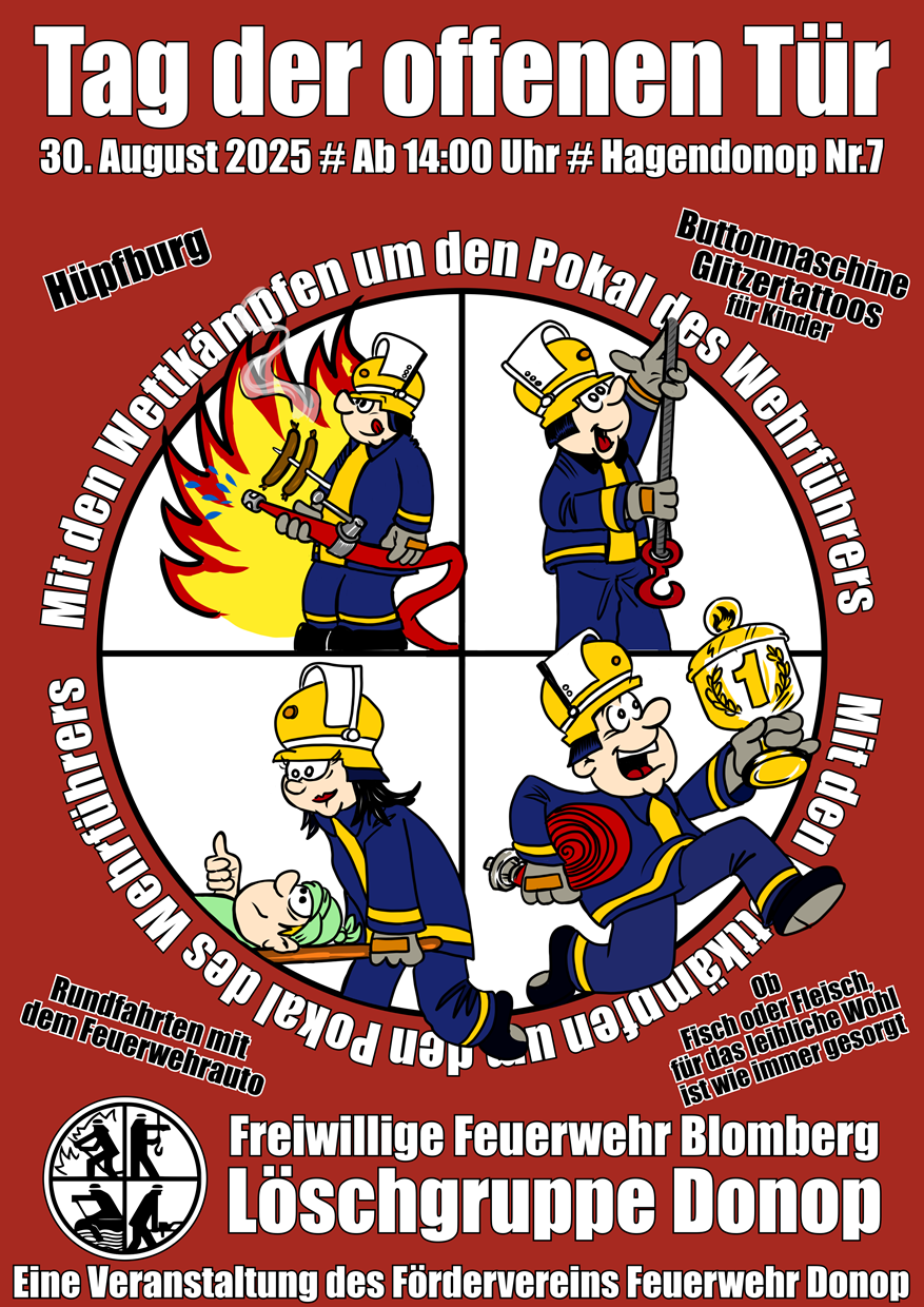 Am 30.08.2025 richtet die Löschgruppe Donop den Pokal des Wehrführers aus. Wie immer wird es spannende Spiele geben die zwischen den Aktiven der Wehr Blomberg aber auch zwischen den Jugendfeuerwehren der Wehr ausgetragen werden. Parallel findet das Kaffeetrinken der Ehrenabteilungen statt. Ehe am Abend der jährliche Tag der offenen Tür der Löschgruppe Donop startet. Dieses Jahr das erste Mal am neuen Standort! Natürlich ist auch für das leibliche Wohl bestens gesorgt.
