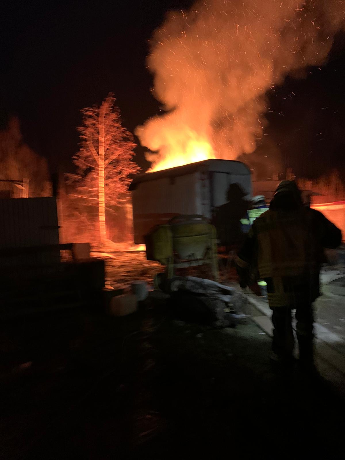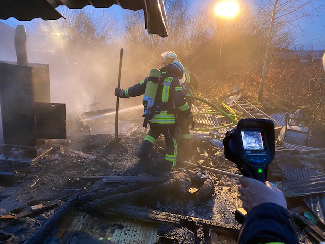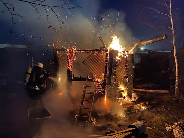 Erneut wurden wir zu einer unklaren Rauchentwicklung in das Industriegebiet alarmiert. Dieses Mal hatte ein Mitarbeiter der Leitstelle jedoch von der Ostwestfalenstraße Feuerschein wahrgenommen. An der Einsatzstelle angekommen stellten wir fest, dass auf einem Betriebsgelände eine Sauna in Vollbrand stand. Eine Person hatte sich, vermutlich bei Löschversuchen, eine Schnittverletzung zugezogen, hierfür wurde umgehend ein Rettungswagen nach alarmiert. Von 2 Seiten wurde ein Löschangriff unter Atemschutz mit 2 C-Rohren vorgetragen. Zusätzlich bauten wir eine Beleuchtung auf, sowie eine Wasserversorgung aus dem Hydrantennetz. Das Feuer konnte schnell unter Kontrolle gebracht werden und nach umfassenden Nachlöscharbeiten und Kontrolle mit der Wärmebildkamera, Feuer aus gemeldet werden.