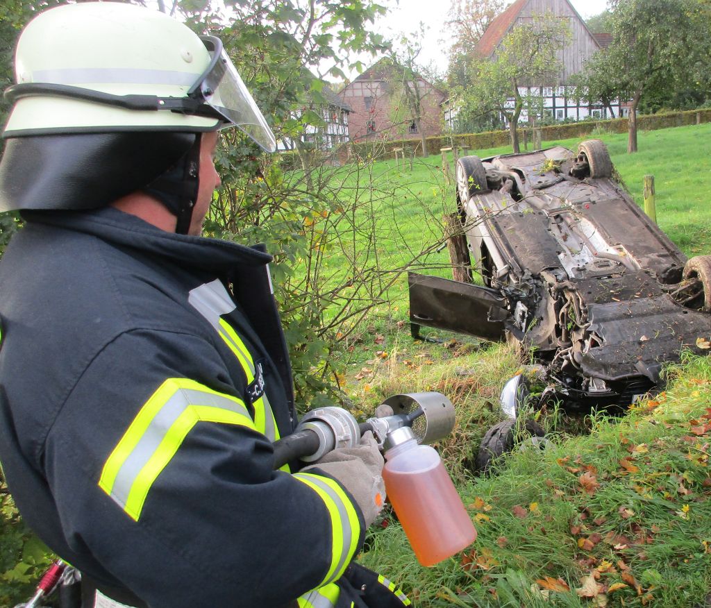 Auf der Landstraße von Mosebeck Richtung Dalborn war ein PKW-Fahrer von der Straße abgekommen. Er schleuderte gegen ein Verkehrsschild und einen Baum und blieb dann auf dem Dach im Straßengraben liegen. Entgegen der Meldung war der Fahrer nicht eingeklemmt, konnte selbst aus dem Fahrzeug klettern und war glücklicherweise nur leicht verletzt. Wir stellten den Brandschutz sicher, sicherten die Unfallstelle und unterstützten beim aufladen. Das Fahrzeug ist total zerstört, die Ursache muss ermittelt werden.