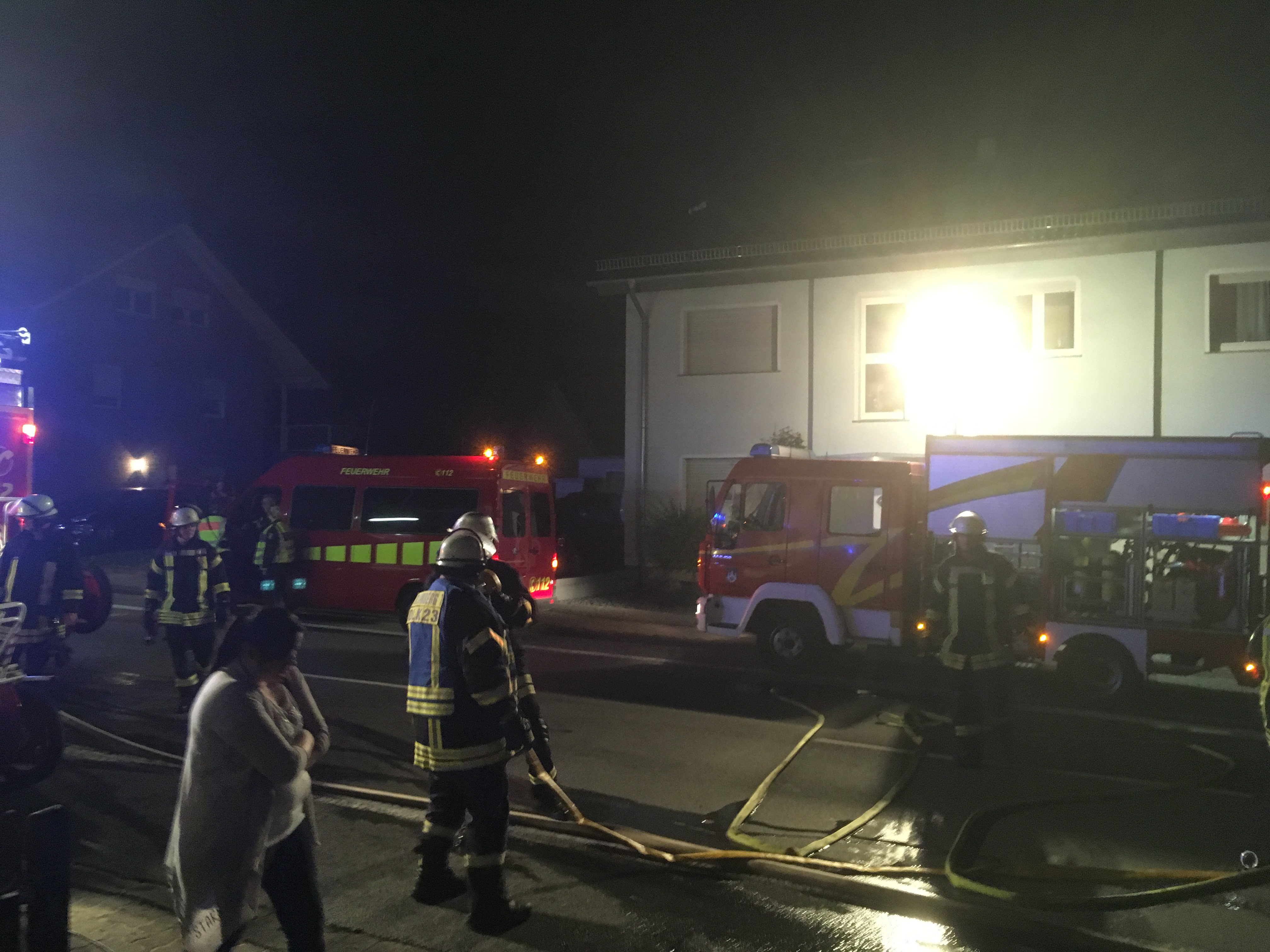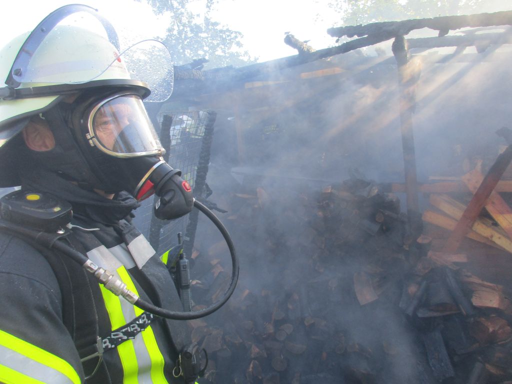 An der Straße „Spielberg“ im Ortsteil Reelkirchen bemerkte ein Feuerwehrkamerad starken Brandrauch und kurze Zeit später hohe Flammen. Fahrradtour abbrechen, Notruf absetzen, Bewohner alarmieren, löschen mit einem Gartenschlauch. Alles passierte in wenigen Sekunden, der in Vollbrand stehende Holzschuppen konnte jedoch nicht mehr gerettet werden. Ein Übergreifen auf die angebaute Garage und Kleintierstallungen und Volieren konnte aber verhindert werden. Die zuerst eintreffenden Einsatzkräfte drangen unter Atemschutz in den Schuppen vor, löschten Glutnester und räumten Brandgut aus. Weitere Einsatzkräfte legten eine Wasserversorgung vom nahen Hydranten. Der zerstörte Schuppen musste weitgehend ausgeräumt werden, da das trockene Brennholz und Bauholz tief eingebrannt war. Die Brandursache ist unbekannt, die Schadenshöhe muss ermittelt werden.