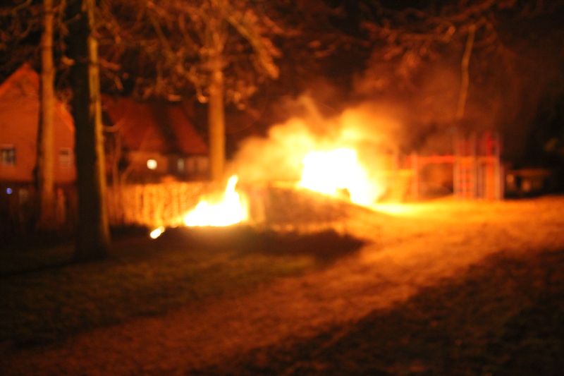 Auf dem Spielplatz am „Groene Plaats“ in der Gartenstraße bemerkte ein Anwohner, dass eine erdbedeckte Spielröhre in voller Ausdehnung brannte. Er alarmierte die Feuerwehr, sein Löschversuch mit einem Handfeuerlöscher zeigte keine Wirkung. Nach dem Eintreffen gingen wir unter Atemschutz mit 2 C-Rohren zum löschen vor. Das Feuer war in der Röhre schnell gelöscht aber sie wurde komplett zerstört. Der Sachschaden ist noch nicht zu beziffern. Der Spielplatz wurde gesperrt. Die Brandursache ist zur Zeit nicht geklärt aber die Polizei hat die Ermittlungen aufgenommen und geht verschiedenen Zeugenaussagen nach.