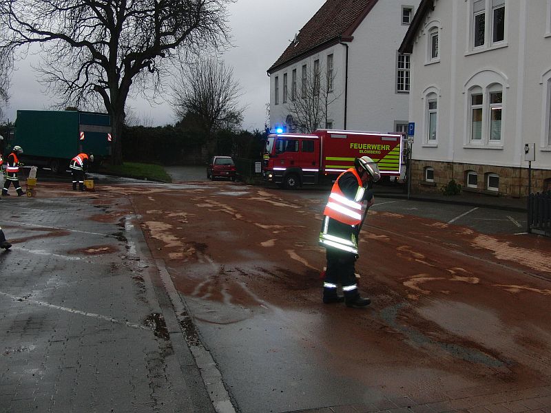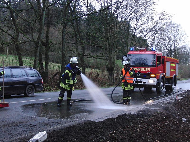 Eine Ölspur zog sich von Donop, Abfahrt Ostwestfalenstraße, bis zur Gemeindegrenze und weiter nach Dörentrup. Es handelte sich um einzelne Ölflecken. Es wurde Bindemittel aufgebracht und eingefegt, um die Rutschgefahr zu beseitigen.