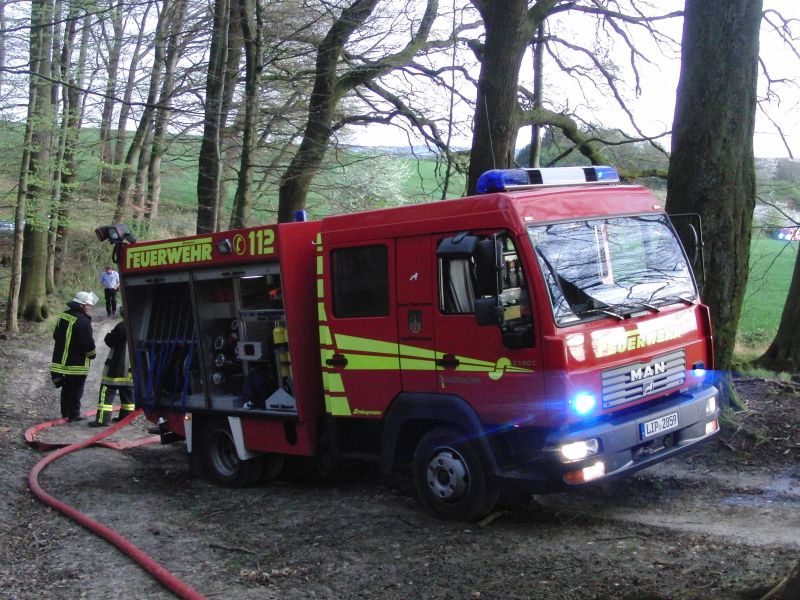 Die unklare Rauchentwicklung klärte sich als lichterloh brennender Jagdsitz. Vom Aufbau blieben nur noch rauchende Trümmer übrig, die zum Fahrgestell eines als Unterbau genutzten Anhängers gehörten. Eine massive Buche wurde stark in Mitleidenschaft gezogen. Durch den schnellen Einsatz konnte ein größerer Waldbrand verhindert werden. Zur Kontrolle des Waldbodens wurde die Wärmebildkamera eingesetzt. Der Boden wurde ausgiebig gewässert.