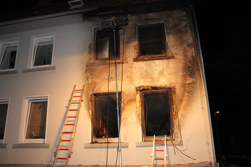 In einem Zweifamilienhaus bemerkte ein Bewohner einen Zimmerbrand. Sofort unternahm er einen Löschversuch, der allerdings aufgrund des fortgeschrittenen Brandverlaufs erfolglos war. Auf der Fahrt zur Einsatzstelle erhöhte die Leitstelle von Feuer 3 auf Feuer4. Beim Eintreffen der ersten Einsatzkräfte kam es schon zum Brandüberschlag an der Außenwand in das erste Obergeschoss. Der Raum im Og. stand ebenfalls unter Feuer. Zwei Bewohner waren in zwischen durch Rauchgas verletzt. Der Dachüberstand hatte Feuer gefangen.