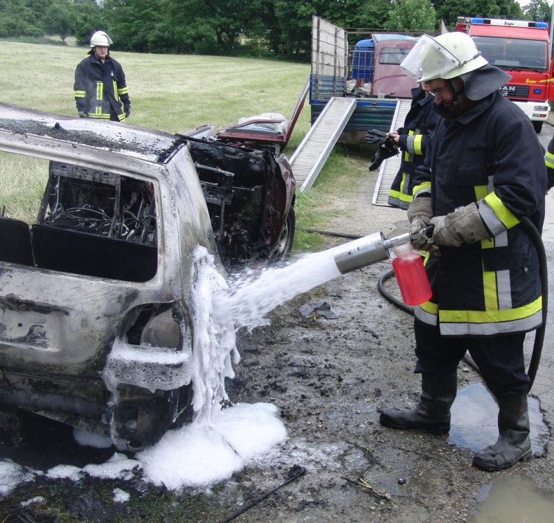 Brandursache: Ein Wertstoffsammler hatte von einer Anwohnerin den Pkw geschenkt bekommen. Mit einem Winkelschleifer schnitt er Dach und Türen ab, um den Pkw platzgünstig auf seinem Transporter verladen zu können. Beim Durchtrennen des Bodens vor der hinteren Sitzbank durchtrennte er auch die Kraftstoffleitung und sofort entstand ein heftiges Feuer durch den auslaufenden Kraftstoff.