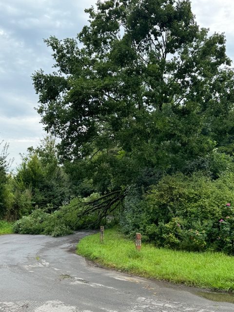 Eine dicke Eiche war aus unbekannten Gründen auseinandergebrochen und versperrte die Meinberger Straße (B1) sowie die Straße Am Sauren Krug. Wir zerteilten den Baum auf der Bundesstraße mit der Motorsäge und reinigten die Fahrbahn. Um die andere Seite kümmerte sich der Straßenbaulastträger Straßen NRW.