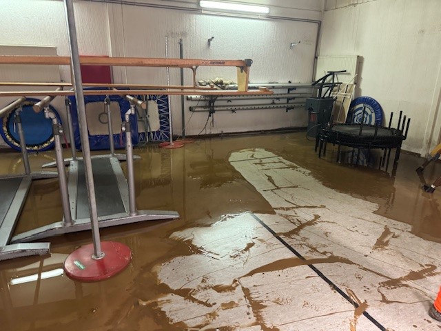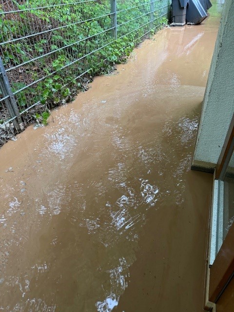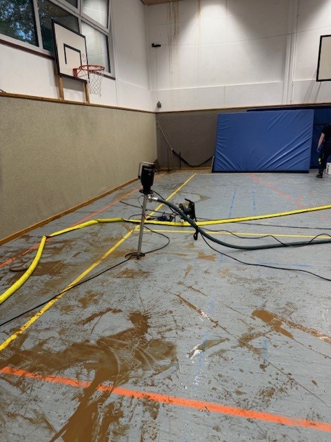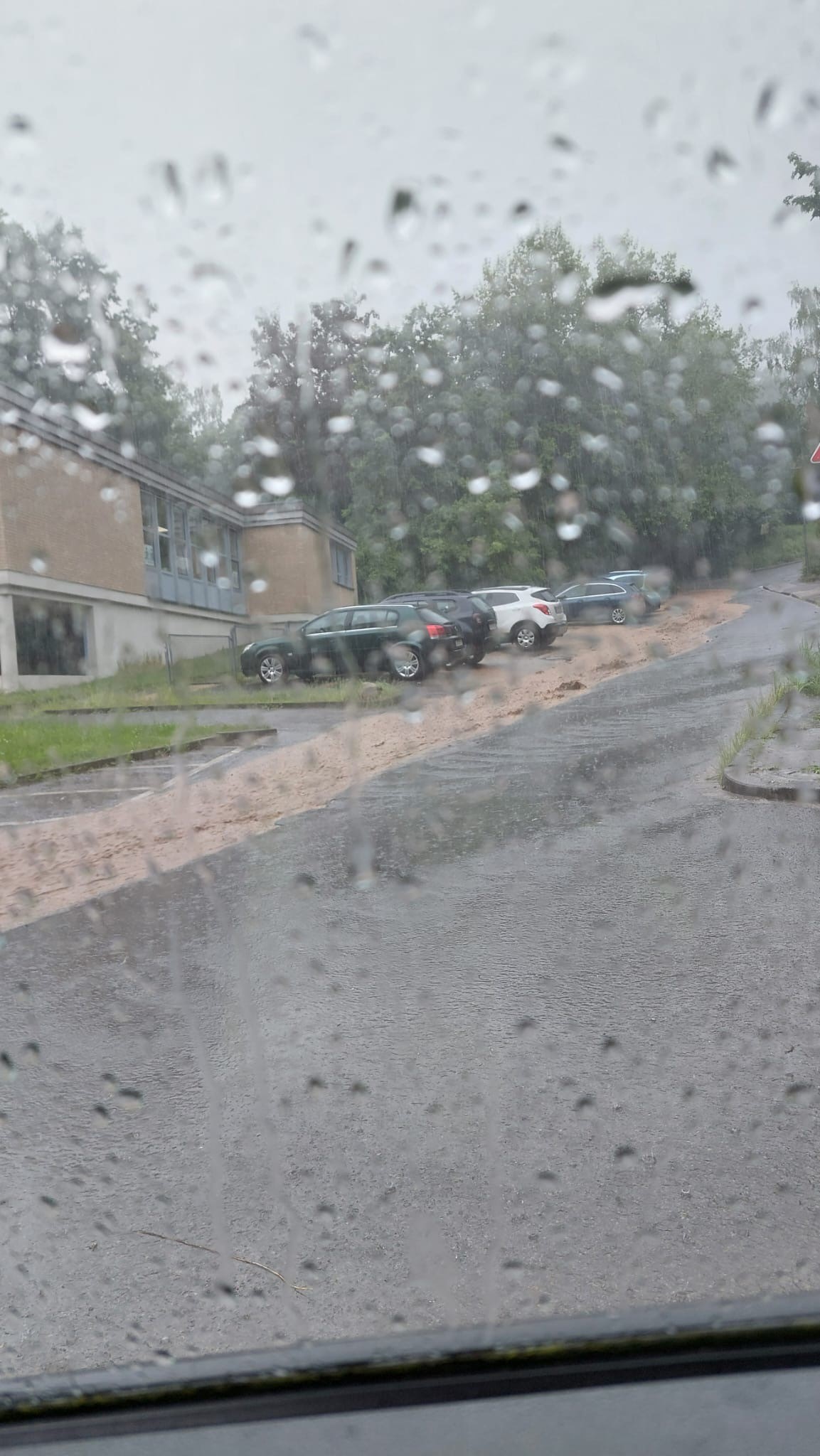 Dieses Mal war es jedoch so, dass die Wassermassen sich nicht nur auf die Fahrbahn begrenzt haben, sondern den Kindergarten mit Schlamm zugesetzt haben sowie die Turnhalle unterspült wurde. Der komplette Holzfußboden der Turnhalle wurde dadurch unterspült und das Wasser drückte an den Rändern hoch und setzte die Halle unter Wasser und Schlamm. Es mussten Löcher in den Hallenboden geschnitten werden um das Wasser absaugen zu können. Im Laufe des Einsatzes wurden weitere Einsatzkräfte nachalarmiert, um der Lage her zu werden. Durch die Zusammenarbeit der Feuerwehr mit Mitarbeitern von Baubetriebshof und der Blomberger Immobilien und Grundstücksgesellschaft gelang es den Schaden nahezu auf die Turnhalle zu begrenzen. Der Kindergarten blieb fast trocken im Innenbereich, schlimmer betroffen war der Außenbereich der mehrere Zentimeter mit Schlamm bedeckt wurde. Wir setzten mehrere Wassersauger und Tauchpumpen ein um das Wasser aufzunehmen. Die Fahrbahnen wurden mit Wasser gereinigt sowie mit Fahrzeugen des Baubetriebshofes von Schlamm und Geröll befreit. Bürgermeister Christoph Dolle erschien gestern Abend ebenfalls an der Einsatzstelle um sich ein Bild der Schadenslage zu machen. Er dankte allen Mitarbeitern und Einsatzkräften für Ihre Arbeit. Im Laufe des Einsatzes wurden Sandsäcke zur Einsatzstelle befördert um ein weiteres Eindringen von Wasser und Matsch in die Kita sowie den Kinderhort zu verhindern. Diese Maßnahmen zeigten Wirkung. Die Verpflegung übernahm die Johanniter Unfall Hilfe mit der mobilen Küche. Vielen Dank dafür! Insgesamt waren ca. 30 Einsatzkräfte im Einsatz. Für die Zeit der Aufräumarbeiten musste die Kreuzung Paradies komplett gesperrt werden.