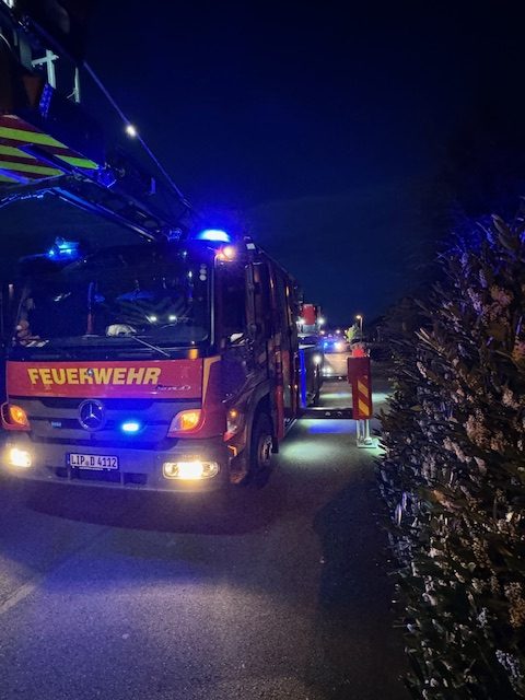 Eingesetzte Fahrzeuge: MLF Herrentrup, MTF Herrentrup, HLF 20 Blomberg, ELW 1 Blomberg, DLK 23-12 Blomberg, TLF 4000 Blomberg, LF 20 KatS Cappel, 1. RTW Bad Meinberg, Polizei