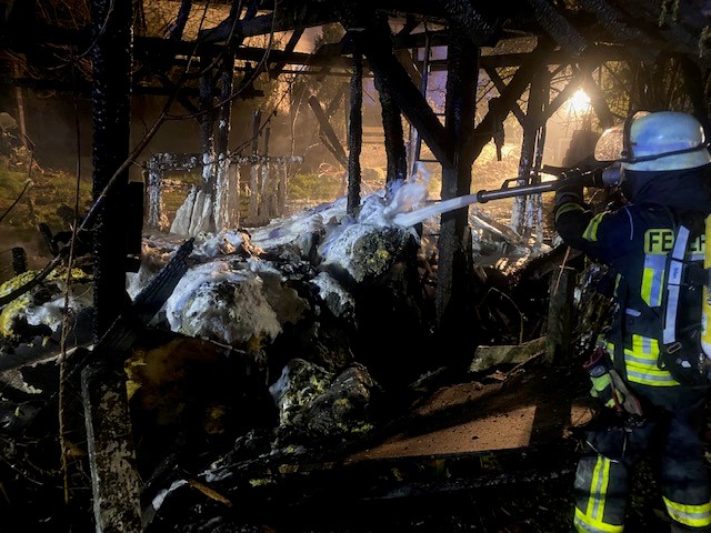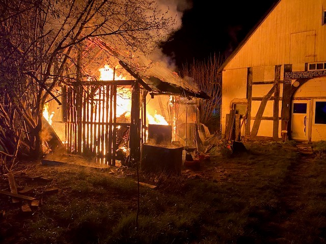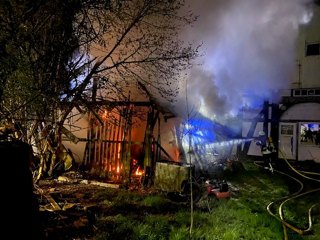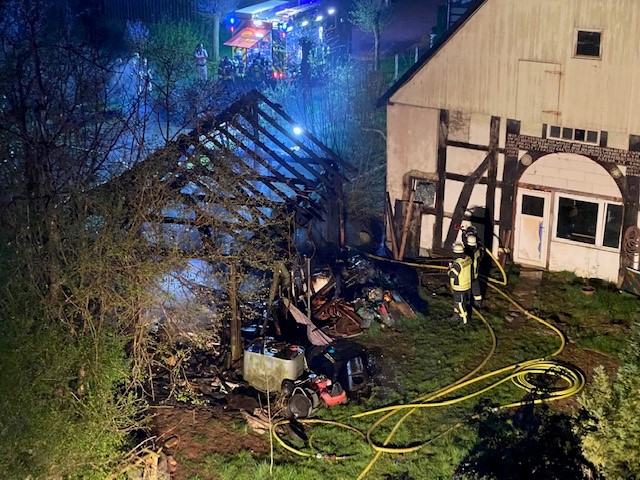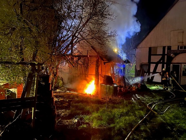 Gestern Abend um kurz nach 21 Uhr wurde die Löschgruppe Herrentrup sowie der Löschzug Blomberg mit dem Stichwort Feuer 2, brennt Gartenhütte in den Fensterweg nach Tintrup alarmiert worden. Da mehrere Anrufe bei der Leitstelle eingingen und das Feuer auf ein unbewohntes Wohnhaus übergreifen zu drohte wurde das Stichwort auf Feuer 3 erhöht. Sofort wurde von 2 Seiten eine Riegelstellung zwischen Wohnhaus und Remise aufgebaut. Dadurch konnte ein Übergreifen auf das Wohnhaus verhindert werden. Parallel durchsuchte ein Trupp das Wohnhaus nach Personen. Zum Glück befand sich niemand darin. Zur Brandbekämpfung unter Atemschutz waren zeitgleich 4 Trupps mit C-Rohren im Einsatz. Zur Wasserversorgung dienten Hydranten und das Tanklöschfahrzeug. Die Brandbekämpfung zeigte schnell Wirkung so, dass wir das Feuer schnell unter Kontrolle hatten. Um ein Aufflammen zu verhindern wurde die Einsatzstelle mit Schaum bedeckt. Zum Eigenschutz für die eingesetzten Atemschutztrupps stand ein Rettungstransportwagen des Regelrettungsdienstes zur Verfügung, der im weiteren Verlauf durch Ehrenamtliche der Johanniter Unfall Hilfe Blomberg abgelöst worden sind.