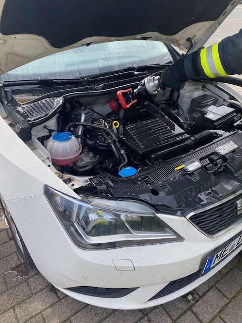 Auf dem Parkplatz eines Baumarktes kam es zu einem Schwelbrand im Motorraum eines PKW´s. Wir kontrollierten mit der Wärmebildkamera im Motorraum als auch im Fahrzeuginnern. DA eine leichte Rauchentwicklung im Motorraum war zunehmen war, löschten wir mit wenig Wasser ab, und kontrollierten erneut mit der Wärmebildkamera. Vorsorglich klemmten wir noch die Batterie ab.