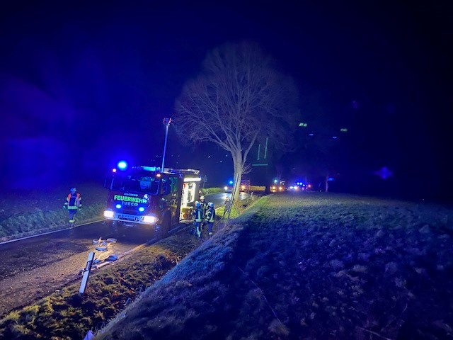 Gestern Abend kam es gegen 21:20 Uhr zu einem schweren Alleinunfall auf der Brüntruper Straße zwischen Brüntrup und Cappel. Ein 22-jähriger Detmolder kam aus bislang unerklärlichen Gründen von der Fahrbahn ab, durchschlug 3 Bäume, überschlug sich und kam auf dem Dach zum Liegen. Der Fahrer wurde mit lebensgefährlichen Verletzungen ins Klinikum Detmold eingeliefert. Das Einsatzstichwort lautete Person eingeklemmt, jedoch konnte sich der Fahrer noch selbstständig aus dem verunfallten Fahrzeug befreien. Die Feuerwehr, die mit den Einheiten Cappel, Großenmarpe, Donop und Blomberg mit 25 Mann vor Ort war, sicherte die Einsatzstelle, leuchtete die Unfallstelle aus und stellte den Brandschutz sicher. Anschließend unterstützten wir die Polizei bei der Unfallaufnahme und reinigten die Fahrbahn.