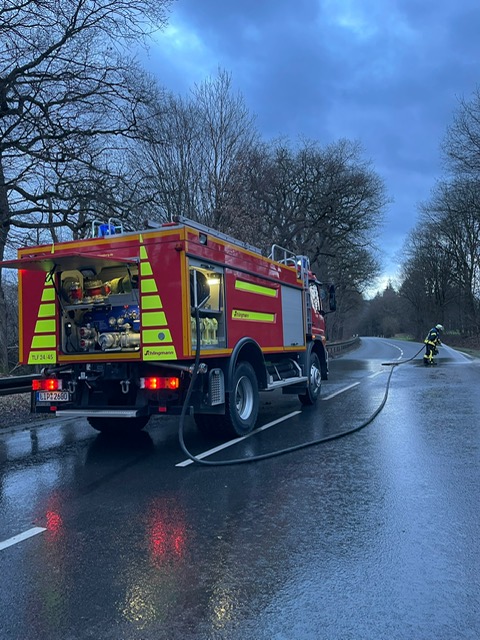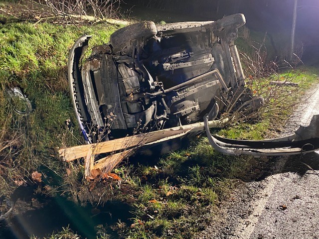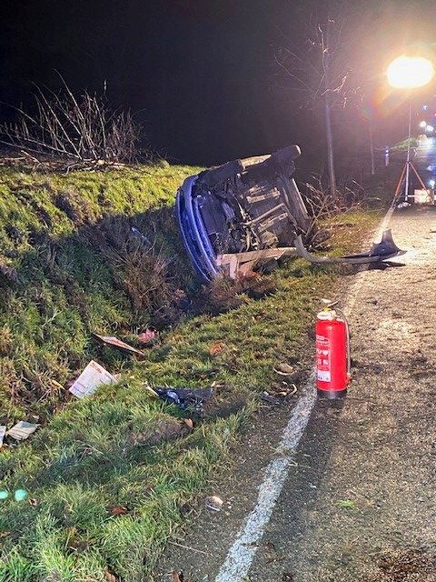 Gestern Abend kam es gegen 21:20 Uhr zu einem schweren Alleinunfall auf der Brüntruper Straße zwischen Brüntrup und Cappel. Ein 22-jähriger Detmolder kam aus bislang unerklärlichen Gründen von der Fahrbahn ab, durchschlug 3 Bäume, überschlug sich und kam auf dem Dach zum Liegen. Der Fahrer wurde mit lebensgefährlichen Verletzungen ins Klinikum Detmold eingeliefert. Das Einsatzstichwort lautete Person eingeklemmt, jedoch konnte sich der Fahrer noch selbstständig aus dem verunfallten Fahrzeug befreien. Die Feuerwehr, die mit den Einheiten Cappel, Großenmarpe, Donop und Blomberg mit 25 Mann vor Ort war, sicherte die Einsatzstelle, leuchtete die Unfallstelle aus und stellte den Brandschutz sicher. Anschließend unterstützten wir die Polizei bei der Unfallaufnahme und reinigten die Fahrbahn.
