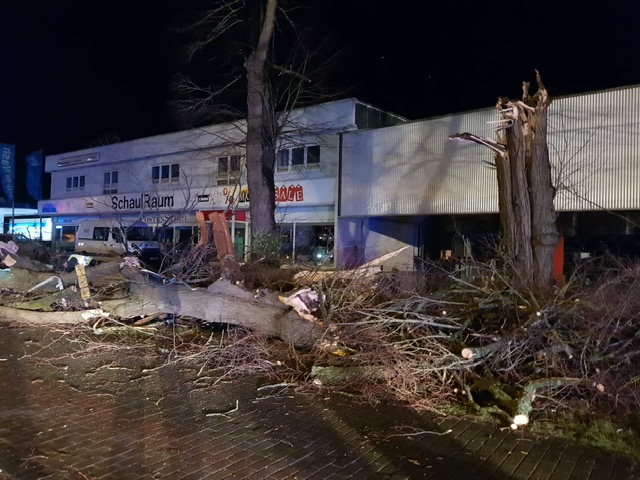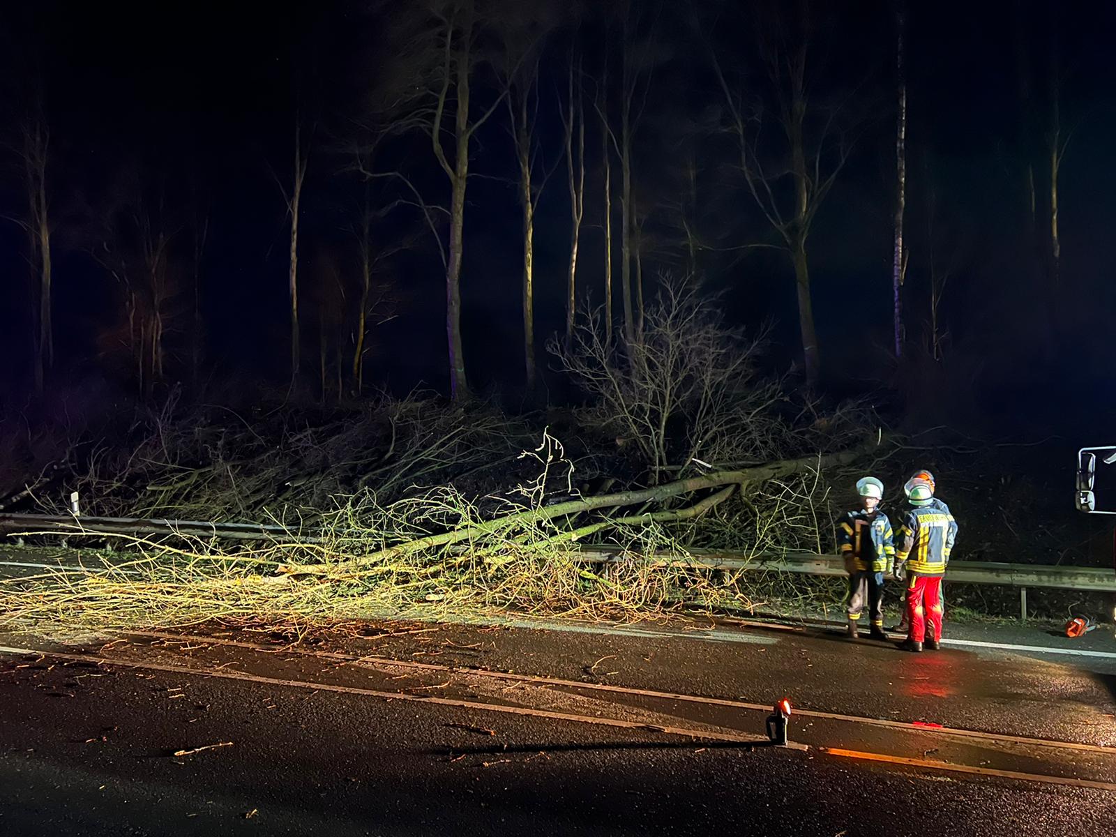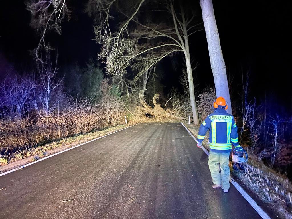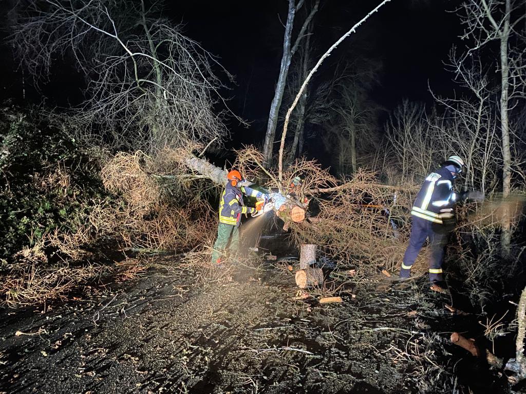 Das Sturmtief Zeynep bescherte der Feuerwehr erneut zahlreiche Bäume und dickere Äste die auf Fahrbahnen und Gehwegen lagen. Aber auch Bäume die drohten auf die Fahrbahn zu stürzen beschäftigten uns die halbe Nacht. An einigen Einsatzstellen, wie zum Beispiel die Pappelallee in Freismissen, war es zu Gefährlich die umgestürzten Bäume zu beseitigen. Hier entschied man sich Sicherheitshalber um eine Vollsperrung der Straße. Auch beschäftigte uns bereits gefälltes Gehölz an Fahrbahnrändern, wie an der Ostwestfalenstraße und der Nessenbergstraße, da diese durch die starken Orkanböen auf die Fahrbahn wehten. Ein Baum stürzte auf einen Elektroverteilerschrank und musste durch den Energieversorger zunächst stromlos geschaltet werden, ehe der Baum beseitigt werden konnte. Ebenso mussten umherfliegende Schilder, Dachteile und ein Baustellencontainer gesichert werden. Auf der Ostwestfalenstraße in Höhe Großenmarpe kam es zu einem beinahe Unfall wobei ein Abschleppfahrzeug über eine Baumkrone gefahren ist, und sein Fahrzeug dabei beschädigte. Ein PKW hatte sich zudem in der Baustelle Schmuckenberger Weg festgefahren und musste mit der Seilwinde des Rüstwagens befreit werden. Im späteren Verlauf wurde dann auch die K61 zwischen Forsthaus und Eschenbruch gesperrt da dort auch mehrere Bäume die Fahrbahn versperrten.